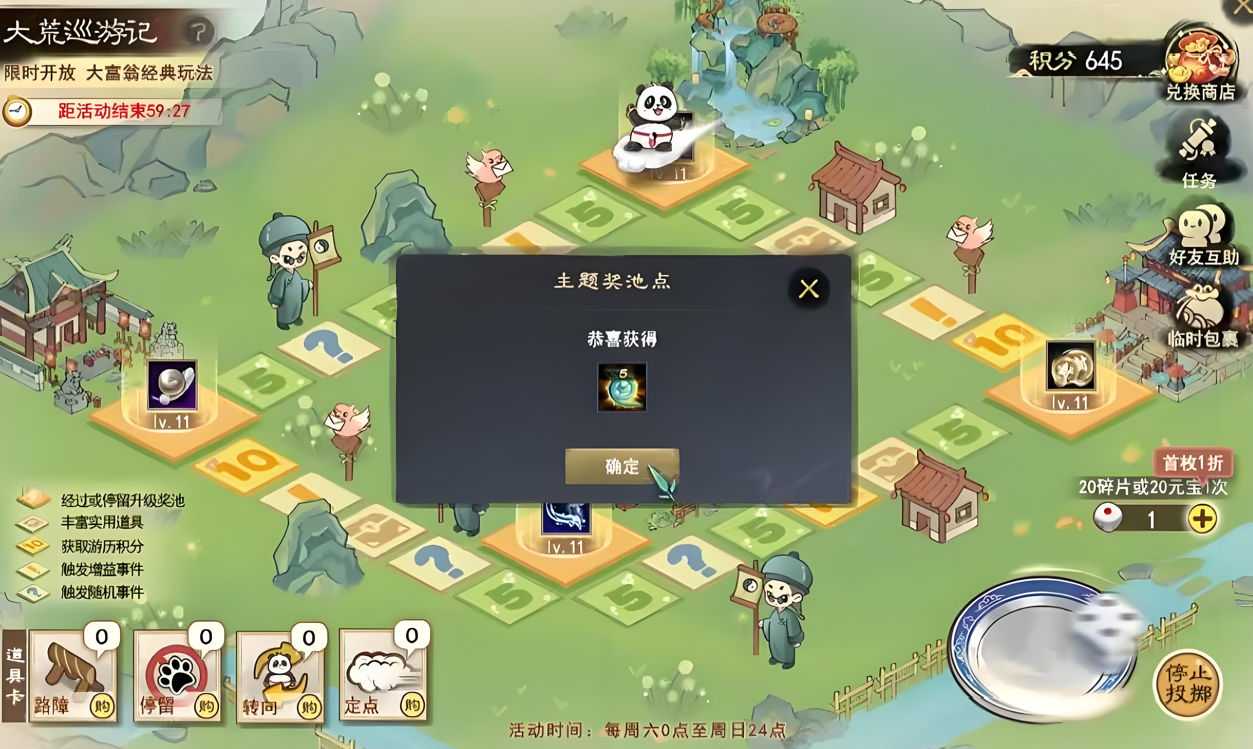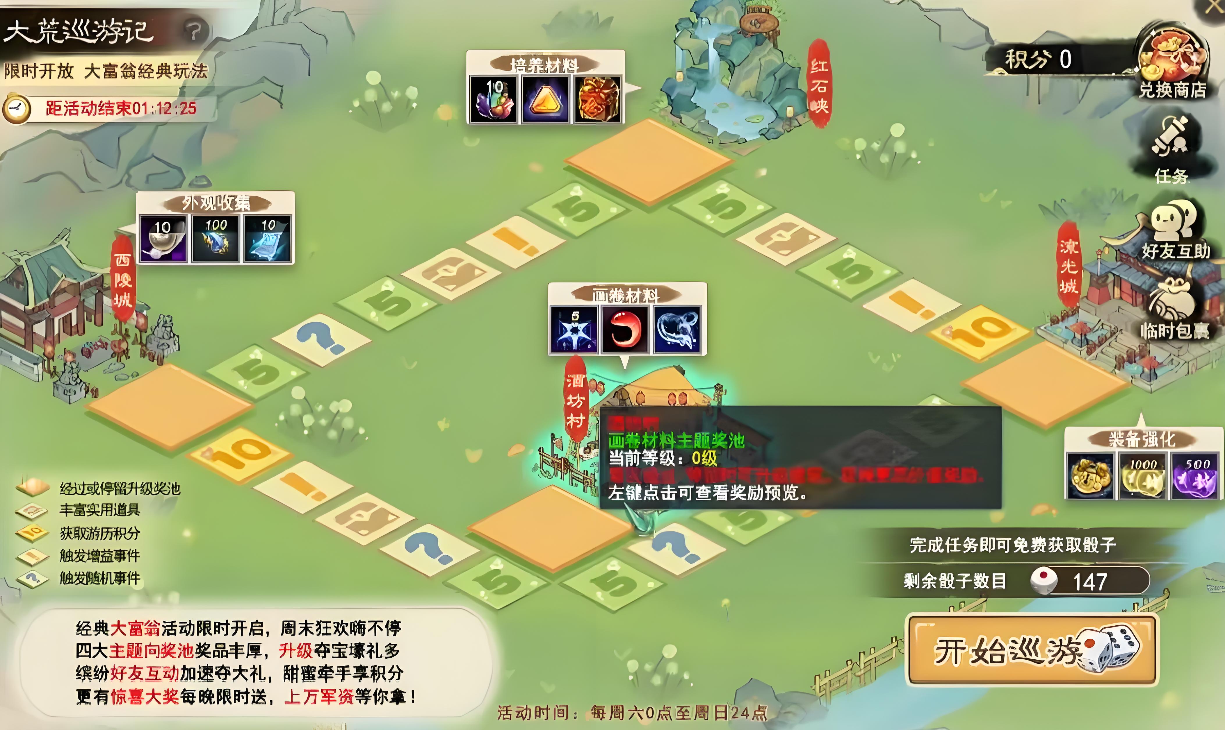 大荒巡游采用经典掷骰行进机制,整体结构类似传统大富翁类玩法,但融合了《天下万象》特有的主题化成长系统。玩家通过投掷骰子决定移动步数,在棋盘上触发各类事件格——包括主题奖池点、小型奖池点、积分点及机会点四大类型。其中,主题奖池点共设四组,每次停留或经过均可提升对应建筑等级;当等级分别达到4级、8级、11级时,奖池内可领取道具将自动升级并替换为更高品质奖励,形成清晰的成长反馈路径。