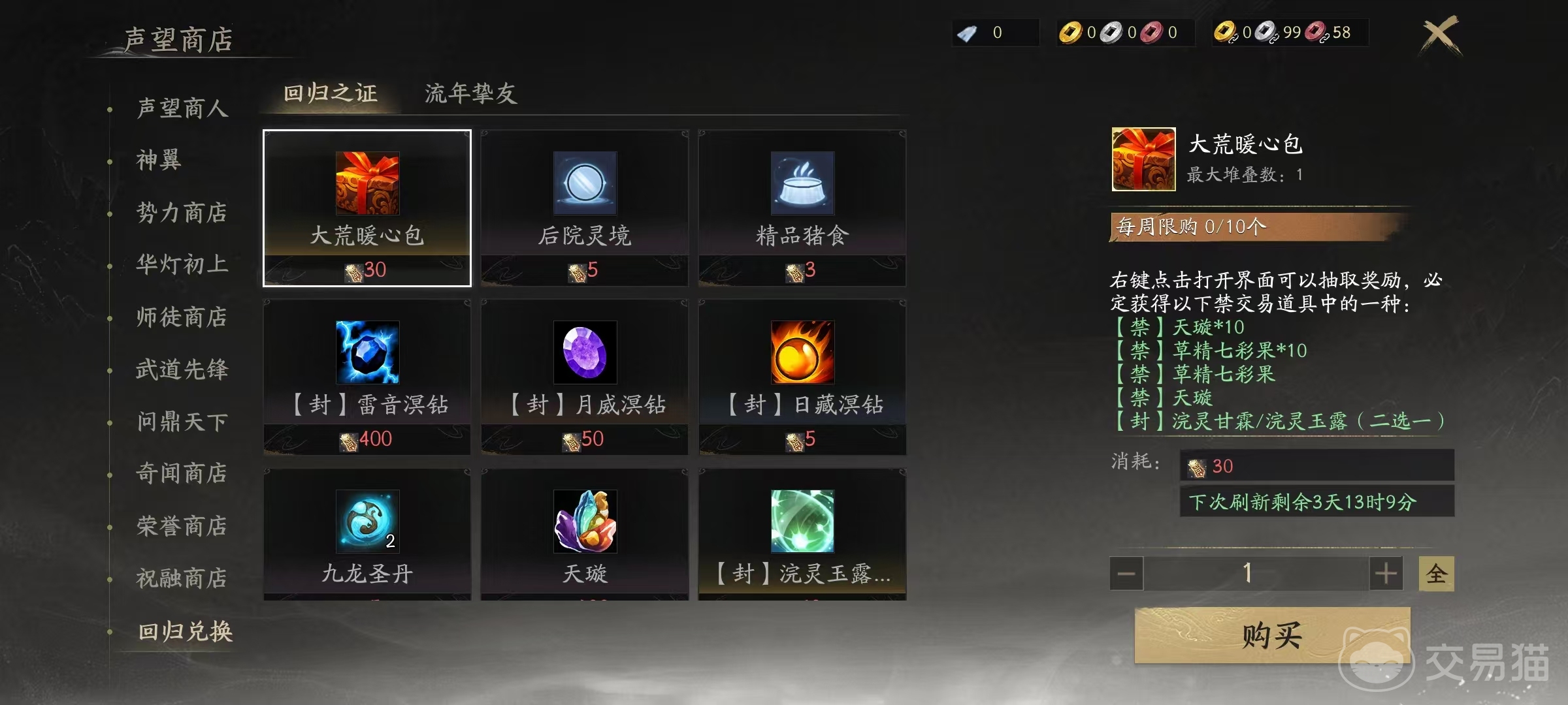 天宝声望以周期性任务为主要来源,涵盖周常玩法如三仙六魔、大荒演武堂、祈福补天等;同时支持按角色等级解锁差异化任务链,包括童趣任务、诗与酒、初入大荒等轻度内容。该声望直接影响宝鉴任务的奖励层级,声望越高,可领取的宝鉴奖励品质与数量越优。华夏王朝声望则聚焦物品回收机制,玩家可向指定声望商人上交副本产出的能量符、配方图纸、怪物掉落杂物及已过期活动道具,换取声望点数,后续用于购买鱼竿、鱼饵等生活类必需品。