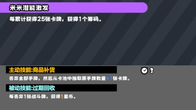 她的主动技能允许弃置全部当前手牌,并额外抽取一张新牌(即抽牌数 = 原手牌数 + 1);被动技能则规定:每弃置一张战斗牌,即可获得1枚星币。二者协同运作,形成高效的“弃牌—获币—抽牌”链路,使米米成为全角色中星币积累速度最快、手牌刷新效率最高的存在。需注意的是,该打法对卡组构成与弃牌时机有一定要求,留牌容错率相对较低。