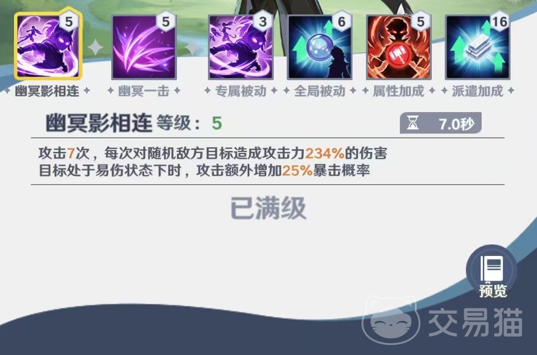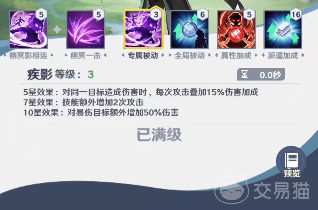 二技能“幽冥一击”为纯粹的单体高伤技能,用于补足关键回合的斩杀线。三技能为专属被动“疾影”,随星级提升呈现三阶强化:五星激活后,对同一目标每次攻击叠加15%伤害加成;七星解锁额外两次攻击次数;十星进一步强化对易伤目标的压制效果,附加50%额外伤害。四技能“天纵奇才”为全局被动,提升藏经阁资源产出效率90%。五技能提供全体属性增益,使所有魂师攻击力与生命值各提升5%。六技能为派遣专精“矿石专精”,当朱竹清被指派至铁匠铺时,相关派遣收益提升200%。