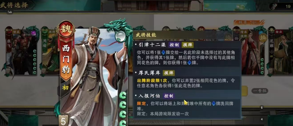 魏国武将西门豹拥有全局牌堆调控能力。一技能【入报河伯】可将当前所有角色的弃牌区牌张及所有角色的手牌(含自身)洗入牌堆,实现牌序重置与资源再分配;另一技能允许将指定花色的卡牌定向转移至其他角色,强化团队配合效率。