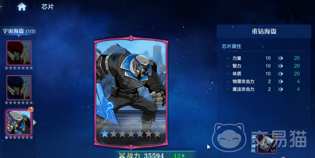 芯片品质等级由低至高分为蓝、紫、橙三档,优先推荐橙色品质芯片。该品质芯片在生命值、攻击力、防御力三大基础维度均有稳定且可观的数值加成,是中后期主力配置。新手阶段可选用紫色芯片过渡——当紫色芯片升至2星后,支持改造功能,可随机重置一条属性词条,具备一定培养潜力;建议保留完整紫色套装,便于后续升级转化。