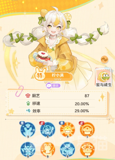 从机制设计来看,柠小满定位为全局型辅助角色。其核心能力围绕三项关键维度展开:第一,制作餐点时可同步提升自身厨艺值,并为全体店员附加厨艺加成,对具备“悠云”特质的同伴额外增益;第二,直接提升所售菜品的基础售价,增强单次订单收益;第三,加快整体制作节奏,在客流高峰期显著压缩出餐周期,有效支撑营业额冲刺与限时活动目标达成。