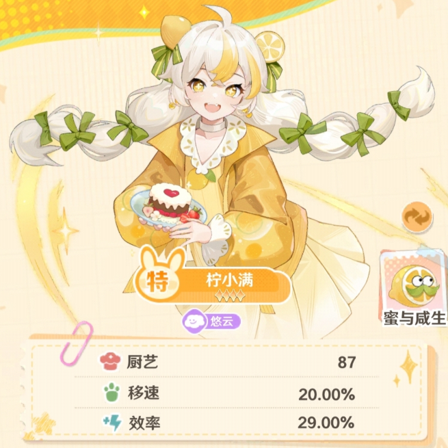 柠小满作为节奏调节型角色,在前中期具有突出战略价值。其被动效果可直接缩短料理制作周期,并加快免费招募冷却时间。这一设计大幅缓解了新手阶段人手短缺压力,加速员工梯队建设进程,助力玩家更快搭建轮岗循环体系。随着星级提升与技能升级,她在日常经营及限时活动中展现出持续增强的容错能力与输出一致性,属于典型的高成长潜力角色。