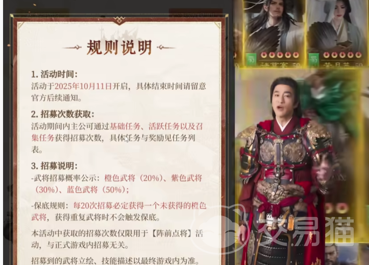 活动任务体系分为三类:基础任务(如注册、分享)、活跃度任务(如每日签到、邀请好友)与召集任务(如组队预约、社群互动),均对应不同数量的点将令奖励。值得注意的是,本次预抽卡全程公开概率——橙色武将抽取概率为20%,紫色为30%,蓝色为50%;同时内置保底规则:累计进行20次抽取,必定获得一个此前未拥有的橙色武将;若抽中已拥有的橙色武将,则不计入保底进度。