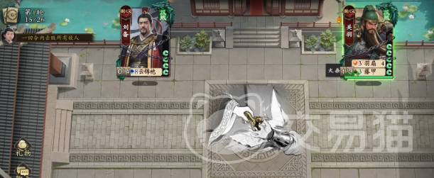 本关设定为单回合内同时击败刘备与关羽,我方仅可操控甘宁。关羽的“万军取首”拥有极高爆发伤害,若正面接招,极易被秒杀。因此必须规避硬碰硬思路,转而构建一套环环相扣的操作链:从开局手牌分析、关键道具夺取顺序,到技能释放时机,每一步都需严丝合缝。甘宁的“锦帆游侠”是整套策略的启动支点,但切忌开局即用——其发动时机直接决定后续连招能否成立。