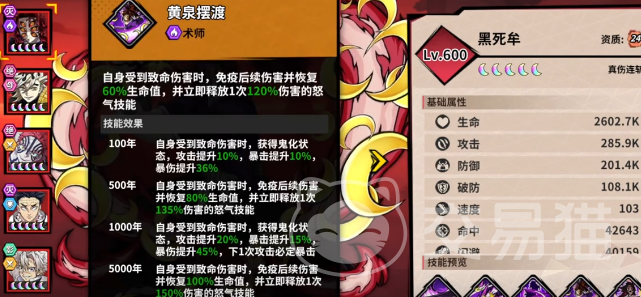 基础属性方面,2602.7点生命值显著突破法师类角色的常规承伤阈值,使其在面对高频闪避阵容时仍能保持稳定站场;103点速度确保其在多数主力输出前完成增益叠加,实现先手节奏掌控。核心技能“黄泉摆渡”具备极强的反制逻辑:当角色承受致命伤害时,立即触发锁血并恢复60%最大生命值,同时瞬发120%怒气值的范围技能——这意味着敌方需付出高额资源压制,却可能在残血瞬间遭遇全额AOE反扑,形成战术层面的预期逆转。