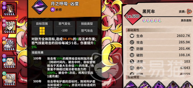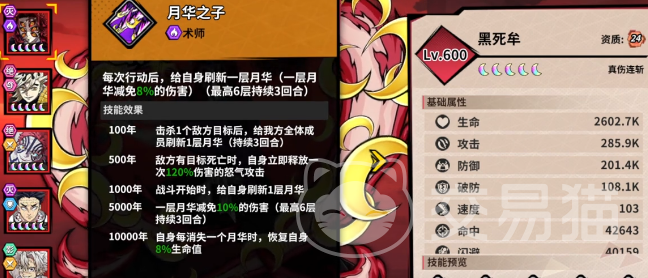 成长体系上,该角色采用“时间刻度”式被动进阶机制:每累计100年战斗时长,提升10%攻击力与暴击率;达500年时获得全额免伤效果,并同步回复怒气;至5000年阶段,触发必暴击+追加攻击双重判定,形成“受击即强化”的正向循环。输出维度中,“月之呼吸”为全体法术伤害技能,基础倍率为94.4%,且每击杀一名目标,后续伤害提升50%,配合高命中率,在残局收割中呈现指数级压制力。1000年阶段解锁真实伤害追加效果,等同于对目标造成100%最大生命值的真实伤害,可无视防御直接补刀;5000年阶段进一步赋予护盾施加能力,在持续输出的同时实现战场控制,达成输出与辅助功能的深度耦合。