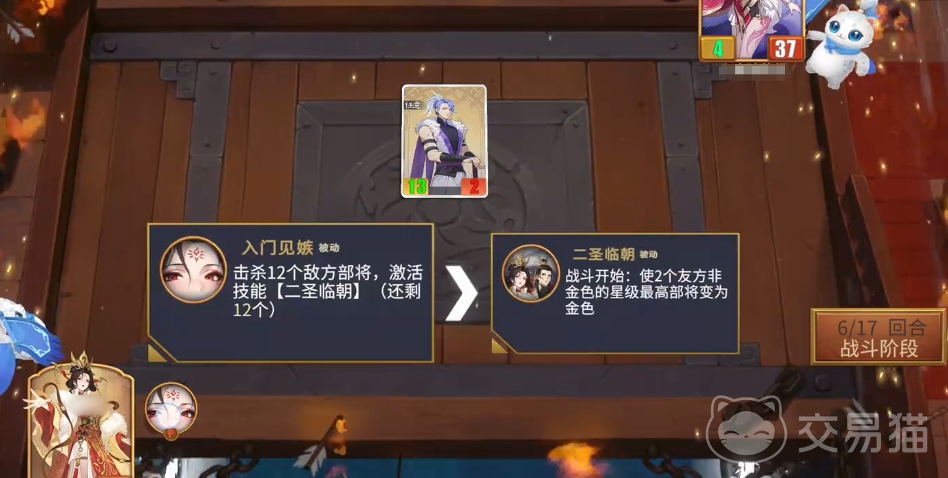 统帅武则天的核心能力为被动型转化机制,需满足明确前置条件方可激活:须在单场对局中累计击杀敌方部将共12名。达成后,该被动将在每回合战斗开始时自动生效——随机选取我方两名非金卡部将,直接晋升为金卡。值得注意的是,此选取并非随机,而是严格依据当前所有非金卡部将的星级由高至低排序,仅取前两位进行转化。这意味着无需消耗金币刷取三连,即可稳定提升关键单位品质,兼具战力跃升与经济节省双重收益。