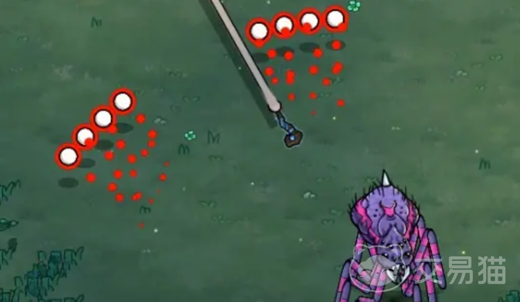 第二类技能为“五连聚散弹幕”。巨蛛先射出五枚独立弹丸,短暂飞行后同步向外横向展开成一排扇形覆盖。此技能释放前存在约0.8秒抬手动作,且弹丸初速较慢。推荐应对方式为:在抬手阶段立即垂直于弹幕发射方向横向侧移,或向后小幅后撤,确保自身始终处于展开后的空隙区域。