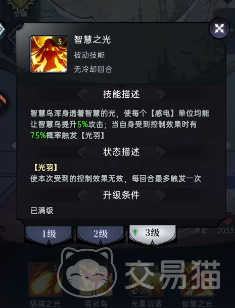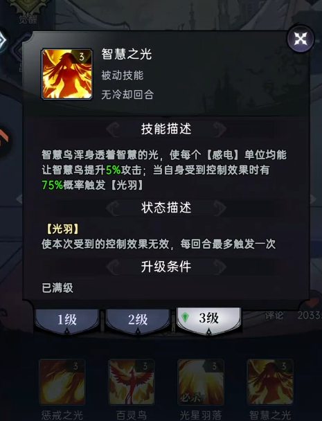 智慧鸟的核心优势集中于其被动技能——“雷霆共鸣”。该被动包含双重关键效果:其一,当敌方单位处于感电状态时,智慧鸟能够获得攻击力加成,且叠加层数随感电目标数量提升;其二,每当角色受到控制效果影响时,立即获得1层“光羽”效果,每层光羽均可抵消一次后续控制,实现事实上的控制免疫。这一机制使其在高压控场环境中仍能维持完整技能循环,输出节奏极少被打断。