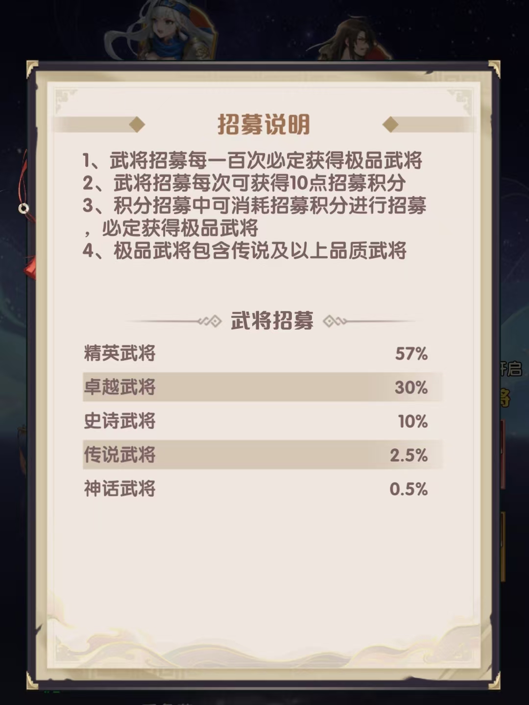 游戏中仅设有一个常驻招募卡池,所有角色均通过消耗“招募令”抽取。卡池内角色按品质划分为五档:神话、传说、史诗、卓越、精英。其中神话级角色拥有全服最顶尖的基础属性与技能机制,但抽取概率最低;传说级角色则在成长性、泛用性与获取难度之间取得良好平衡,是新手至中期主力阵容的核心构成。建议新玩家优先聚焦传说级英雄的积累与培养,避免过早追求高稀有度而影响资源分配节奏。