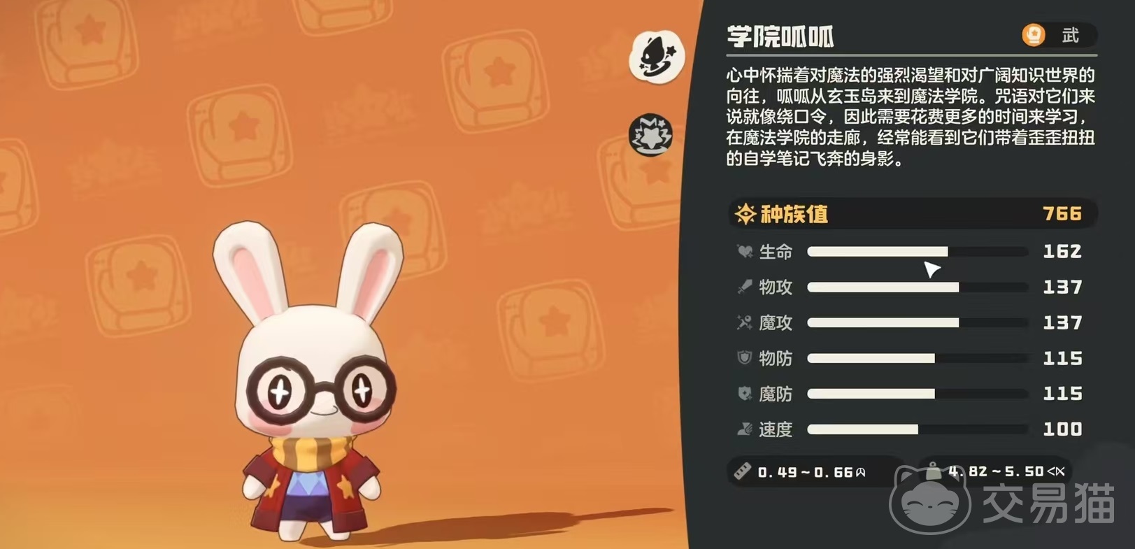 从形象设计来看,学院呱呱采用拟人化兔系造型,双耳修长灵动,身着带有学院徽章的制服,随身携带一本密密麻麻标注错字与反复涂改的咒语手札,施法时常因紧张而结巴停顿——这种反差萌设定强化了角色记忆点。在实战维度上,其总种族值为766,生命、物攻、魔攻三项基础属性均处于高水准区间;物防、魔防与速度虽未达顶尖,但整体均衡性良好,仅在面对高速压制型对手时需注意出手顺序策略。