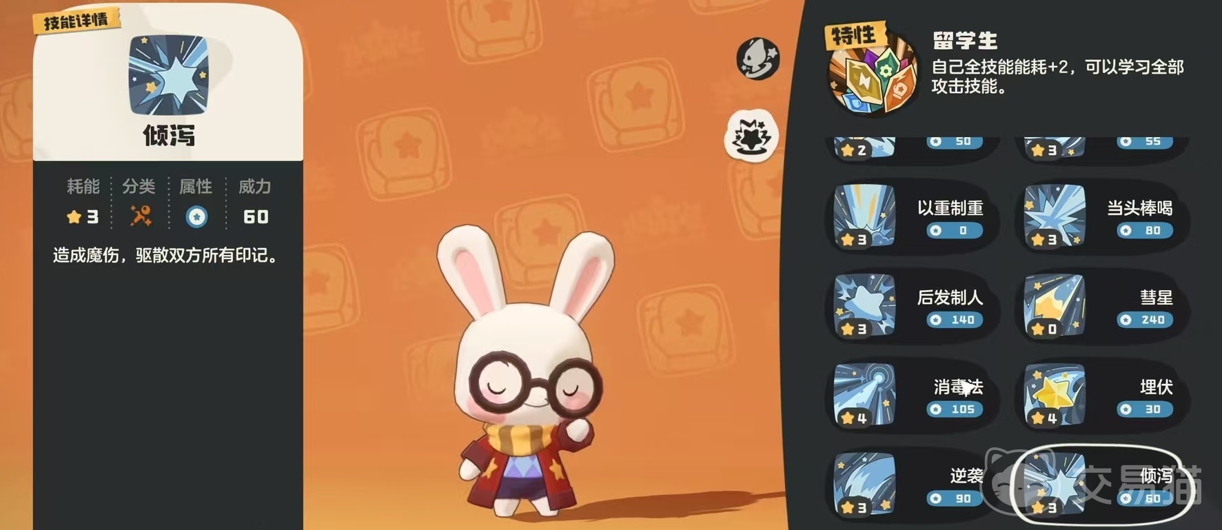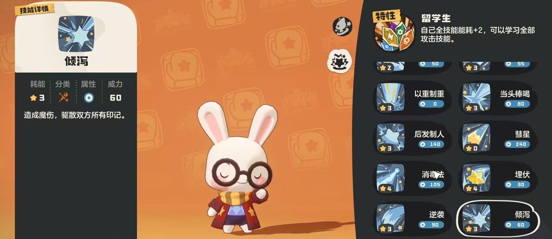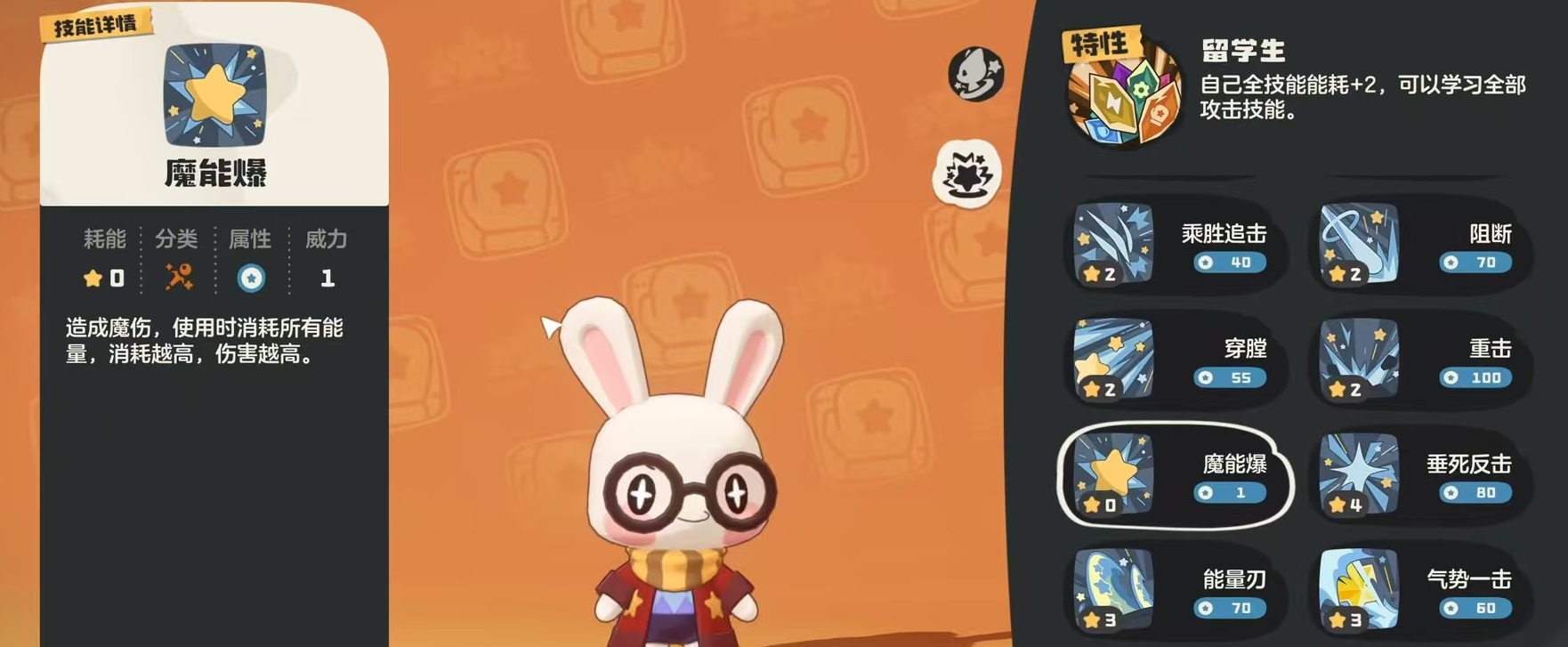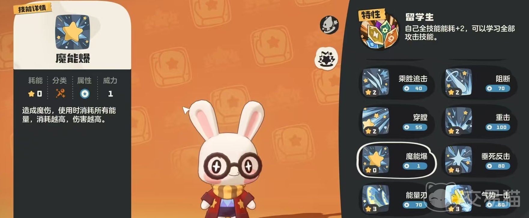 核心机制围绕被动“留学生”展开:所有技能能量消耗固定+2点,但解锁全部攻击类技能的学习权限。该设计本质是资源换泛用性的权衡逻辑——虽抬高了技能释放门槛,却极大拓展了配招自由度。在实际构筑中,推荐搭配唯一可选的普通系技能“魔能爆”,因其伤害随能量消耗提升而递增,恰好将被动带来的额外消耗转化为输出增益,有效抵消机制副作用。