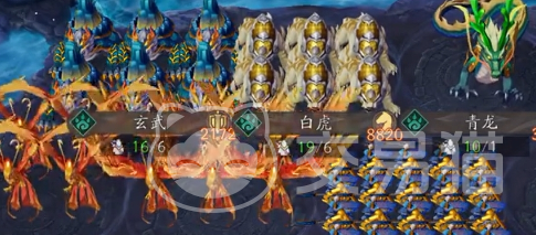 第一套为【四圣兽体系】:由青龙、白虎、朱雀、玄武四张基础卡构成。该组合无复杂启动条件,仅需四者同场即可触发全局星级提升效果——所有四圣兽卡牌统一升至六星。此机制不依赖额外资源投入,属于典型的低门槛高收益白板强化流,适合新手过渡及速组成型场景。