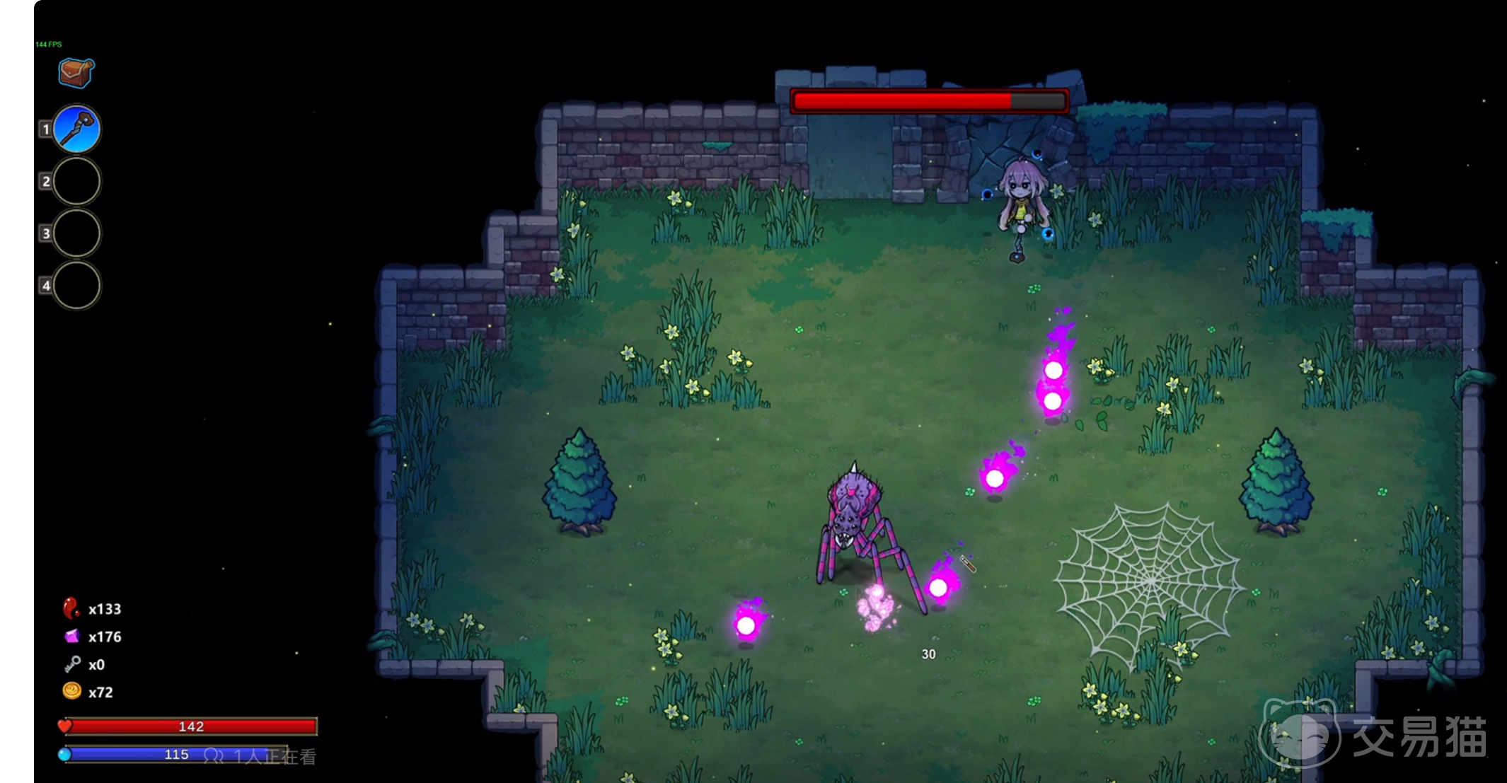 【毒蛛之卵|生命值:1500】 终章Boss拥有四重攻击逻辑:地面毒液滩涂需保持距离规避;单/双毒滚石可通过驱赶至墙体使其自毁,亦可凭借高伤法术提前清除;空中悬停阶段持续倾泻弹幕,此时应沿水平轴做匀速往返跑动,避开弹幕密度高峰区。全程注意控制自身站位,避免陷入毒液与滚石的双重复盖区。
