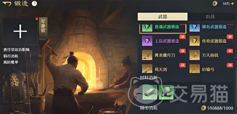 可锻造装备共分两类:武器与防具。不同定位武将对装备属性需求存在显著差异——输出型武将侧重攻击加成与暴击率提升,辅助型侧重命中、治疗量或减益成功率,坦克型则优先选择生命值、防御力与格挡率相关词条。因此,锻造前需结合阵容规划明确目标方向。