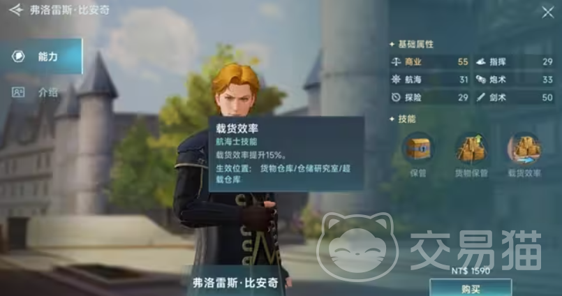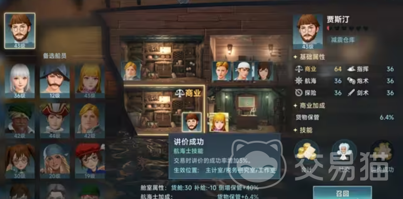 另一位适配新手过渡期的航海士是贾斯汀。他同样具备会计系专精能力,三技能可在交易过程中依据当前溢价水平,额外提升3%的成交成功率。该效果生效前提是将其配置于税务研究室或工作室。若前期船只尚未完成主题改装,仅能开放货仓位置,则贾斯汀暂可临时驻守,但此时三技能处于未激活状态,务必在中期完成船体升级后及时调整部署位置。