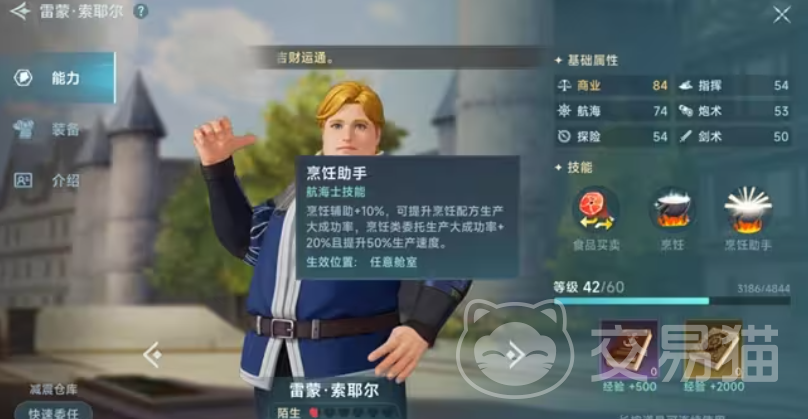 烹饪系统作为游戏中重要的生产子模块,同样依赖专业航海士支持。雷蒙是目前唯一具备明确厨艺专精路径的航海士。其一技能提供基础厨艺属性,三技能则提升烹饪辅助成功率10%。在委托生产场景下,配合其他增益手段,整体配方研制成功率最高可提升20%,进而推动生产周期缩短约50%。该角色虽定位为辅助,但在远洋长期航行、高阶食材加工及稀有料理量产等环节中,具备不可替代的战略价值。后期可延伸发展为“烹饪+钓鱼”双线成长路线,强化资源自给能力。