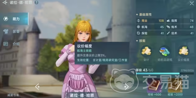 新手阶段推荐优先培养航海士诺拉。其核心价值在于商业链路的三重增益:一技能提供会计类基础属性加成;二技能触发纺织品交易退税机制,返还20%投入资金,显著提升单次周转净收益;三技能进一步扩大溢价空间,将交易价溢价上限提升3%。需注意,诺拉必须部署于主计室或税务研究所方可完全激活全部技能效果,若错配至其他功能舱室,将导致关键加成失效。
