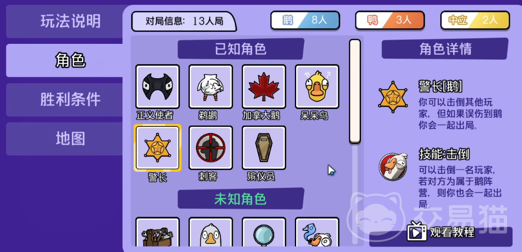 警长拥有一次主动使用“击倒”技能的机会,可对任意一名玩家发起强制控制。若目标为鸭子阵营成员,则成功将其淘汰;但若误判目标所属阵营(如击倒鹅或中立角色),则警长自身将立即出局。这一设定决定了该角色兼具高风险与高回报特性,要求玩家具备扎实的信息整合能力与逻辑推理素养。