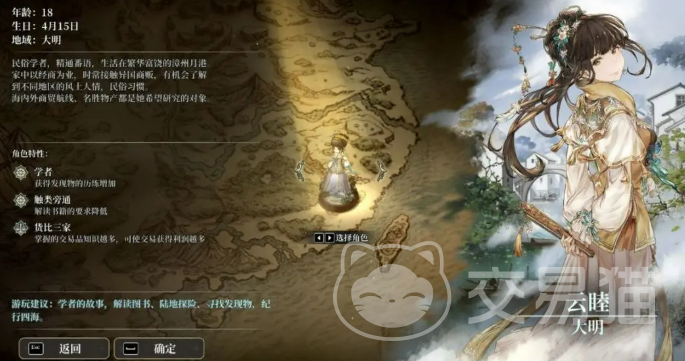 开局阶段提供四位可选主角,各自拥有独立出身设定与成长倾向。首推云睦作为入门首选——其初始活动区域锁定于东亚海域,地理参照系贴近现实认知,大幅降低方位判断难度;同时,该角色专属能力聚焦贸易知识积累,每完成一次合法交易均可提升对应属性,长期叠加后显著增强商品议价能力与跨港差价识别效率。其余角色虽在探险、战斗或外交维度具备差异化优势,但对操作节奏与系统理解要求更高,建议进阶后尝试。