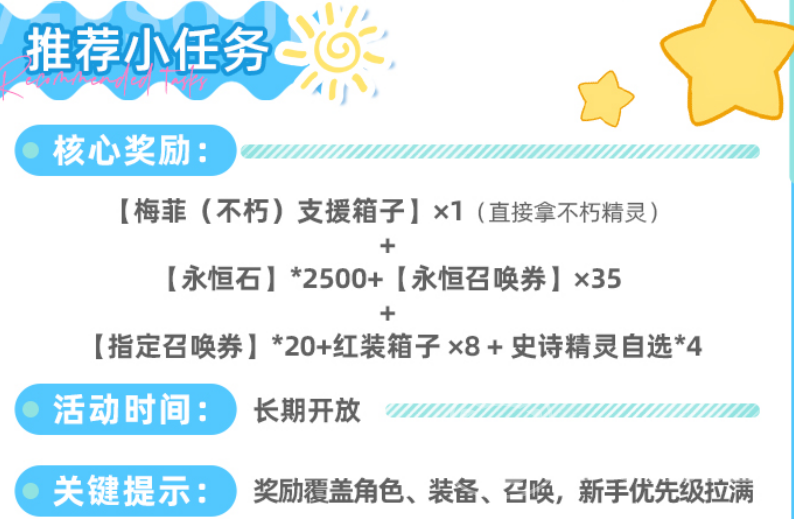 “推荐小任务”为常驻型引导类系统,全程无时间限制,任务设计紧密贴合新手流程。全部25项任务完成后,总计可获得2500颗永恒石。任务内容涵盖基础操作验证,例如通关指定难度副本3次、将任意3名角色提升至30级、完成精灵图鉴激活等,基本可在自然推进主线过程中同步达成。除永恒石外,该任务链额外提供35张永恒召唤券、20张指定召唤券、8个红色品质装备宝箱以及4个史诗精灵自选权,综合资源价值远超单一货币收益。