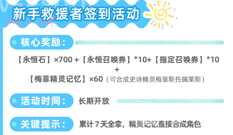 签到类福利共设两档:其一为“新手救援者签到”,持续7天,满勤奖励为700颗永恒石、10张永恒召唤券及10张指定召唤券;其二为“上线纪念签到”,周期为14天,累计可得2400颗永恒石与20张指定召唤券。两项叠加后,签到总收益达3100颗永恒石,折合约10张永恒召唤券的等价资源,属于低操作成本、高确定性的稳定补给。