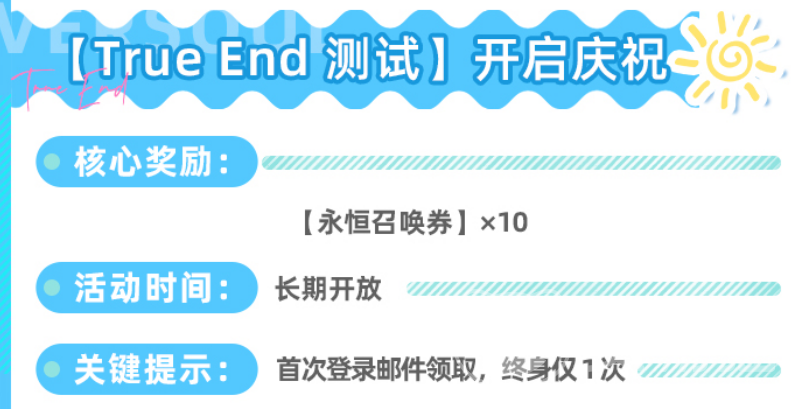 “True End测试开启庆祝”为开服专属一次性福利。所有新创建账号在首次登录时,系统将自动向邮箱发放10张永恒召唤券。虽未以永恒石形式呈现,但按当前兑换比例折算,实际节省3000颗永恒石支出。该奖励不可重复获取,且无需任何操作,仅需留意登录后查收邮件并及时领取即可。