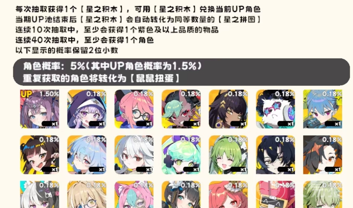 需特别注意:UP池仅提升目标角色概率,并无“歪后必出”机制;且星之积木具有时效性——在UP池结束时将自动转化为星之拼图,无法跨池继承。因此,推荐玩家在确保拥有至少100次抽取量的前提下开启UP池抽取。即便未在百抽内直接获得目标UP角色,也可用所获星之积木完成兑换。若同期开放多个UP池,且玩家有多个目标角色需求,可优先在某一池中完成UP角色获取并积累部分星之积木,再于另一池中补足至100枚,即可直接兑换第二名UP角色,从而兼顾目标覆盖率与资源零损耗。