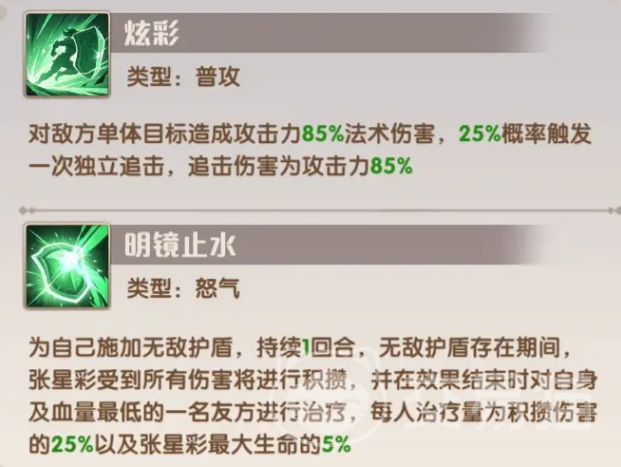 张星彩是前期最值得信赖的前排人选。其怒气技能“明镜止水”可提供一回合无敌护盾,期间所受全部伤害将被暂存,并在护盾结束后转化为治疗量:治疗值=暂存伤害×25%+自身最大生命值×5%。该机制兼具承伤缓冲与团队续航功能,显著提升阵容生存能力与操作容错空间。