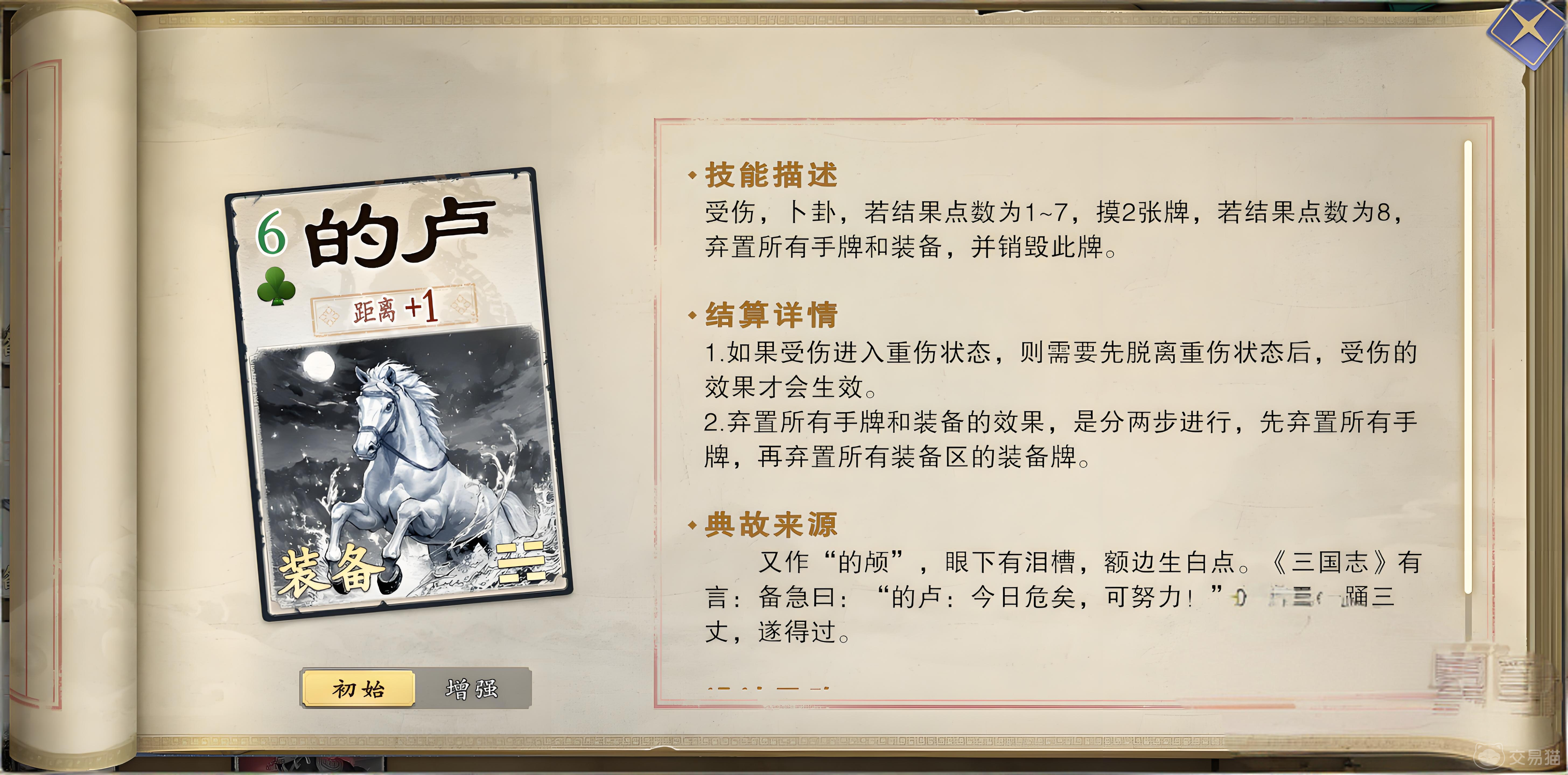 的卢是防御系代表坐骑,基础防御数值突出,可有效吸收高额伤害。其独有机制为“卜卦”:当武将受伤触发时,系统随机生成1至8点数。若结果为1–7,则己方武将摸两张牌;若结果为8,则强制弃置全部手牌与装备,且的卢卡牌永久销毁。该机制具有明确双刃特性,需玩家预判风险并配合手牌管理策略使用。