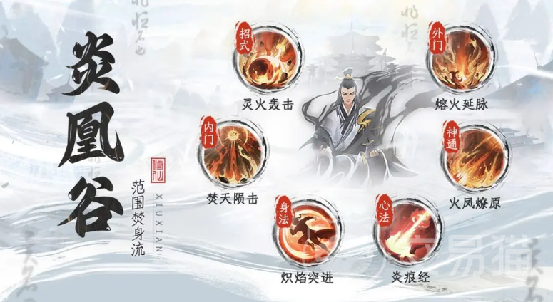 炎凰谷主修火系焚杀体系。外门技能主打直接伤害与“焚身”状态叠加,该状态不仅造成持续灼烧,还可与毒性身法产生联动,触发额外爆伤;当多名敌人被焚身影响时,群体伤害倍率显著提升。心法炎痕经专精续航强化,可同步提升角色生命回复效率与回血转化伤害值,支撑高强度持续作战。