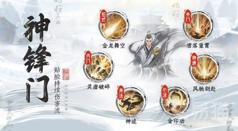 以神锋门为例,该宗主修金系近战流派。外门弟子多以剑为器,强调爆发压制与精准打击,代表招式金龙舞空可在造成高额单体伤害的同时附加洞察效果,显著提升对近身敌人的持续压制力;内门则侧重空间机动与控制衔接,核心技能灵虚破阵可撕裂虚空实现瞬移突进,配合后期心法使用,可叠加眩晕、加速与破碎虚空三重协同效应,形成高频率控场—输出闭环。