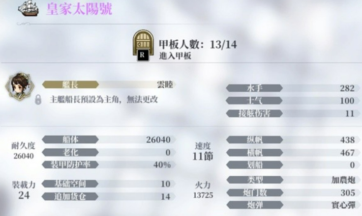 首推法国皇家战列舰——皇家太阳号。该舰以“太阳王”为名,承载着顶级战列舰的设计理念。其耐久值高达26040,是当前版本中生存能力最强的海上平台之一;11节的基础航速虽非顶尖,但具备极强的逆风保持能力,转向响应远超同吨位舰船,大幅降低复杂海况下的操控门槛。火力方面,侧舷齐射总输出达13725,在标准对战中可单轮击沉五艘大福船,同级战舰中无出其右。更值得注意的是,该舰在近战接舷阶段同步提升攻防属性,并附带常驻减伤效果,实现远程压制与白刃压制的双重优势。需注意的是,该舰属于游戏后期解锁内容,需完成相应章节及条件后方可获得。