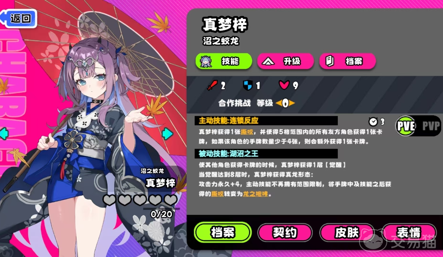 在合作模式中,真梦梓的主动技能可为自己生成一张“撕咬”,同时为半径五格内所有友方单位补充一张手牌;若某队友当前手牌数不足四张,则额外再为其提供一张。该补牌行为会触发她的被动效果——每为一名队友补充一张手牌,即叠加一层“真龙印记”。当印记累计达八层时,真梦梓将进入“真龙形态”:立即获得+4攻击力的常驻增益,且后续使用主动技所获得的“撕咬”将自动升级为“龙之咆哮”,显著提升单次攻击的爆发能力与战术延展性。