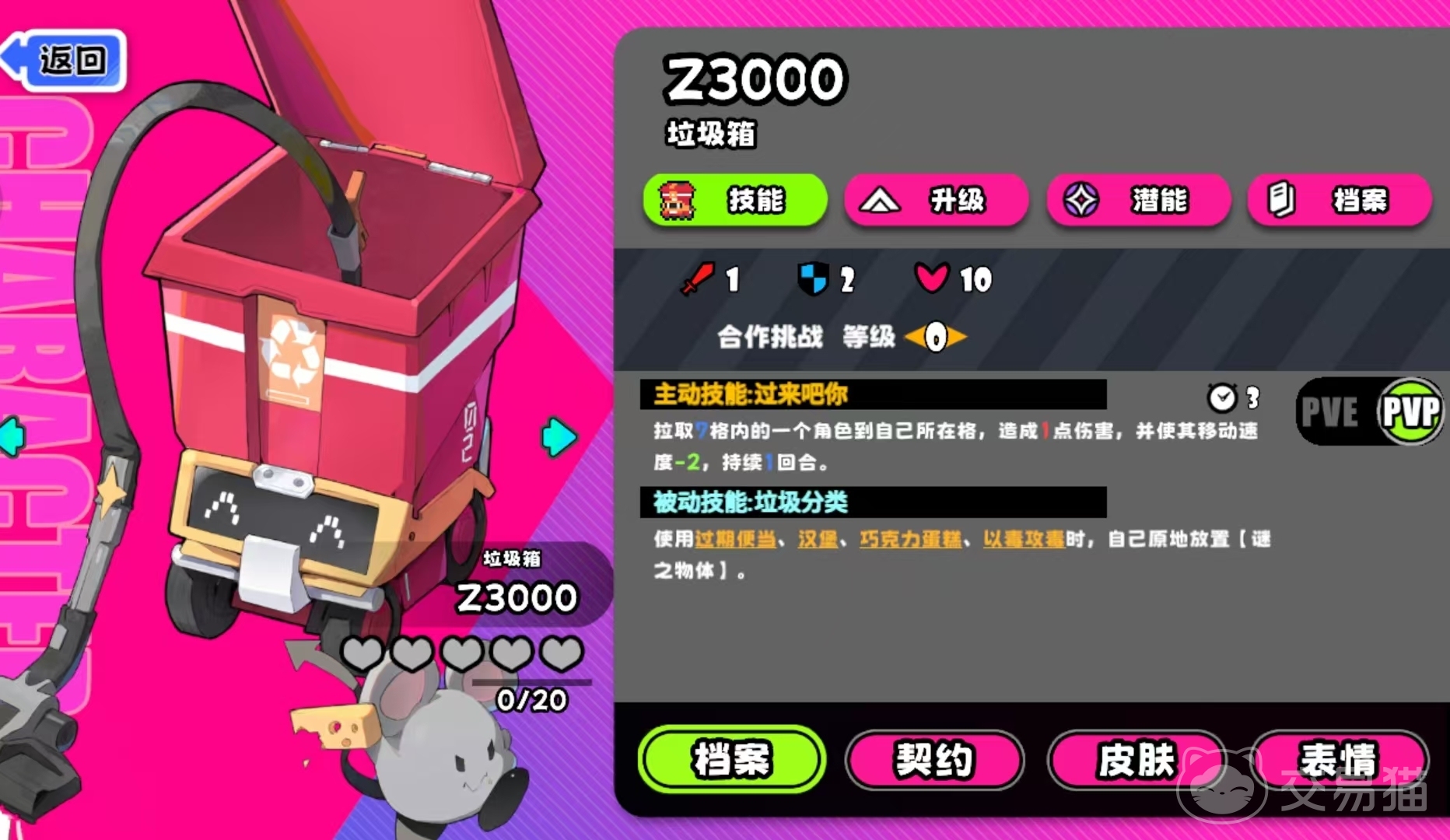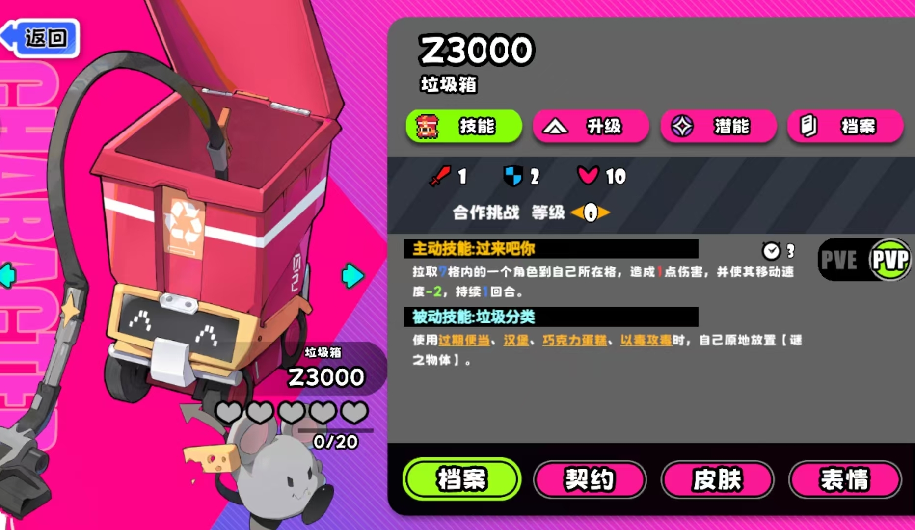 垃圾桶的主动技能核心功能为:将目标强制牵引至自身所在格,并附加直接伤害。但具体效果会随模式变化而动态调整,被动机制亦存在差异化设计。在PVP对战中,该技能作用范围为7格,命中后造成2点伤害,并使目标移动速度降低2点;被动则表现为:每当玩家使用“过期便当”类手牌时,将在当前所处格生成一个“迷之物体”,后续若有敌方单位踏入该格,将立即触发对应影响。由此,在标准对战节奏下,该技能可被高效运用于追击残血目标、完成收割并回收星币,形成高性价比的终结链路。