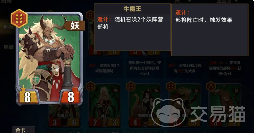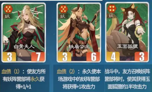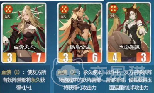 妖族阵营则采用多核协同召唤体系,主打单位数量压制与持续战场控制。主力卡牌包括牛魔王、铁扇公主、石矶娘娘、白象精、玉面狐狸与白素贞。该体系无绝对单一核心,而是通过多张具备召唤能力的卡牌构建动态兵力网络。石矶娘娘是前排承伤枢纽,其“不屈”状态可使召唤物获得高额减伤,并在濒死时触发免死效果,实现对敌方前排输出的定向牵制与反制。牛魔王侧重召唤物质量输出,其召唤单位的基础攻击力直接挂钩自身力量属性,形成随角色成长而同步强化的输出模型。铁扇公主则聚焦召唤物功能强化,其技能可为全场友方召唤物附加攻击加成,且与牛魔王召唤单位存在隐性协同增益,进一步放大群体输出效能。