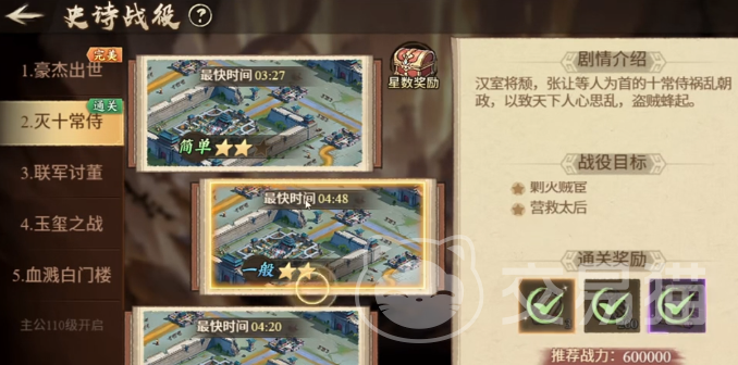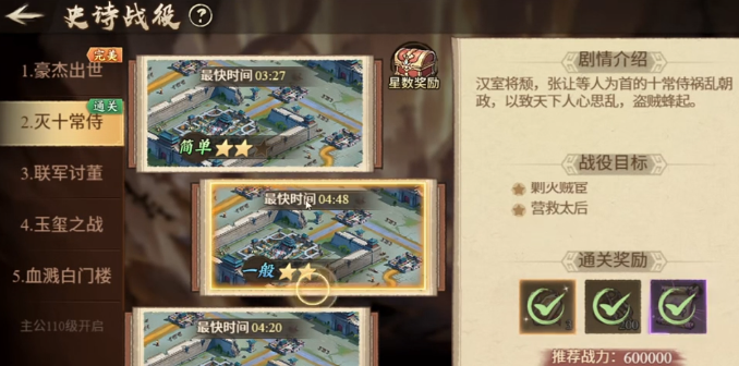 史诗战役共设普通、精英、地狱三档难度,各档独立累计星级。通关用时为唯一评分依据——时间越短,星级越高。当三档累计星级达到指定阈值,即可开启限定稀有宝箱,内含武将进阶必需材料及关键资源道具,对前期成长具有决定性作用。新手建议优先完成主线引导任务,熟悉基础操作与战斗机制。在普通难度阶段,系统赠送的太史慈、黄忠、张飞三人组已具备完整功能链:张飞提供爆发式前排压制,太史慈承担中距离持续输出,黄忠则负责远程精准点杀。此阶段无需多线培养,集中资源主升其中1~2名核心武将即可稳定推进。