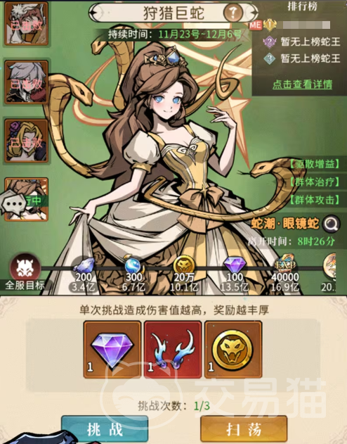 狩猎巨蛇属于全服协同的世界级挑战活动。巨蛇降临周期为14天,期间开放挑战入口;但每周六、日全天关闭。每位玩家每日拥有3次挑战机会,支持直接扫荡获取当日奖励,提升参与效率与资源回报率。