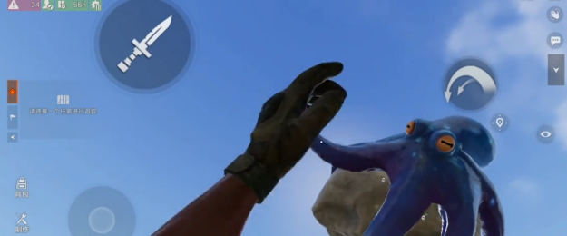 第一款为“石锤·章鱼共生”皮肤,定位为开局核心工具类外观。该皮肤将基础采集工具升格为传说级表现载体:主体为一块灰岩质感的石锤,表面附着一只拟真度极高的蓝色章鱼,其触须具备独立物理反馈,可随挥动节奏产生细微摆动。检视状态下,章鱼会释放深蓝色墨汁特效,配合粒子动态与音效反馈,形成强沉浸式交互体验。实际使用中,敲击树木或矿石时,章鱼肢体同步晃动,显著提升重复操作过程中的趣味性与代入感。