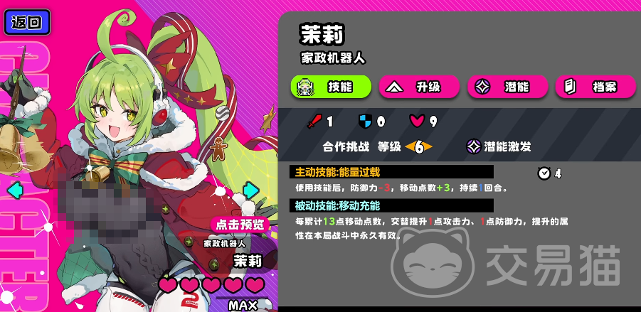 首推角色为茉莉。其外观呈现机械风格,但核心机制归属元素属性。主动技能生效后,可立即获得+3点移动点数;同时触发被动效果——在下一回合内降低自身3点反应率,并额外提供+13点移动点数加成。若在此期间同步提升1点攻击与1点防御,该双重增益将转化为永久属性提升。该特性使茉莉前期成长节奏偏缓,但中后期成型后输出能力极为突出,在高难度关卡中具备极强的不可替代性与压制力。