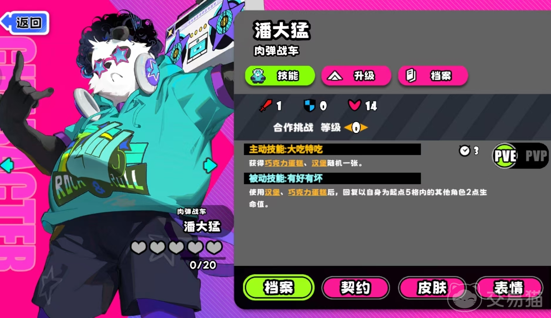 潘大猛的主动技能不消耗行动点,发动即刻获得两张固定手牌,但具体卡种由当前模式决定。在合作模式中,他将稳定抽取【巧克力蛋糕】与【汉堡】——二者均为恢复类手牌;此时其被动效果同步激活:每当使用上述任一手牌,即以自身所在格为中心,为范围内所有友方角色恢复2点生命值,触发无次数限制,且生效即时。而在标准模式下,主动技则赋予【自爆】与【以牙还牙】两张功能性卡牌:【自爆】造成自身损失3点生命,同时对3格内所有敌人强制扣除5点生命;【以牙还牙】则可完全反弹对手施加于自身的任意效果类手牌。
