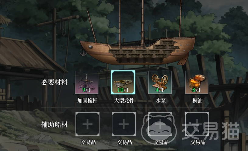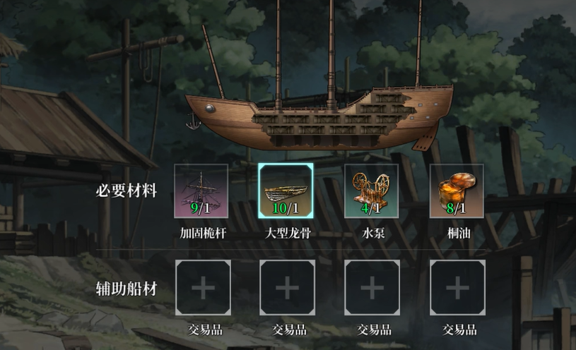 船材获取依赖港口技术度发展。初始阶段,各港口船材铺仅供应基础帆用材料及本地特有涂料(如铜油、石灰)。随着港口技术度提升,高级材料逐步解锁。极品帆布、极品龙骨、极品板材、极品桅杆按季度轮换上架,每次刷新1–2种,刷新池由港口地理归属决定。例如东亚区域的汉阳港,在技术度达到1000后,将稳定纳入极品帆布作为可刷选项。其余港口对应极品材料清单,需玩家实地探访验证。
