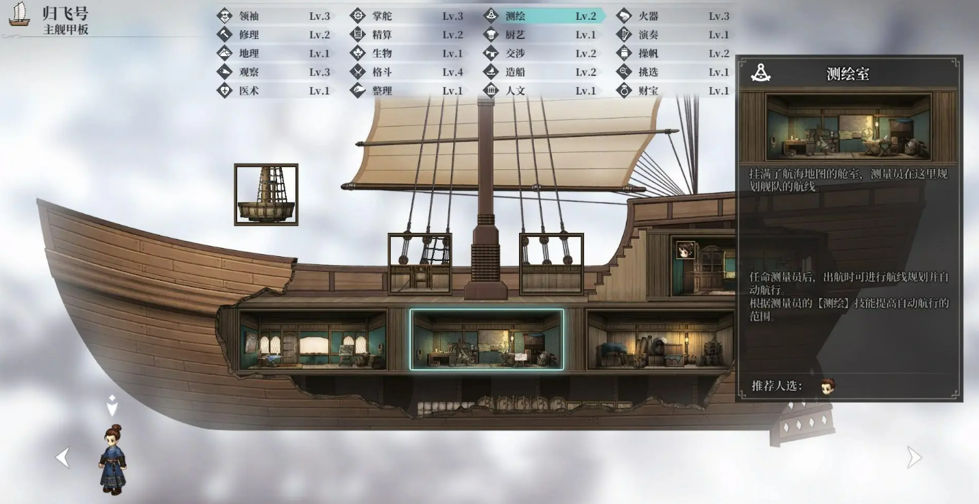 出航前需重点配置三项核心功能模块:瞭望台必须派驻人员,以提升航行途中发现沉船残骸与浅海宝藏的概率;测绘室安排专员后,即可启用自动导航系统,大幅降低手动操舵频次;同时务必持续监控船体耐久度——早期船只老化速度较快,一旦耐久归零将导致航行中断甚至沉没风险。待解锁船匠职位后,修缮问题将迎刃而解。