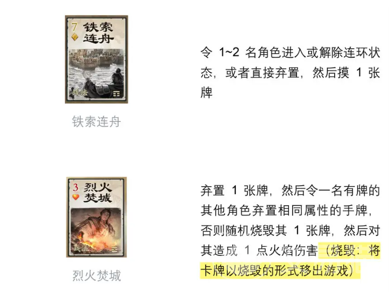 战法牌侧重场面控制与策略延展,包含传统锦囊类效果但机制更为立体。“铁索连舟”可令场上1至2名角色进入连环状态,亦支持主动解除已有连环;“烈火焚城”属于延时类战法牌,置入后迫使持有手牌的目标角色弃置一张同属性手牌,若未执行则随机销毁其一张手牌,兼具压制与干扰双重作用。