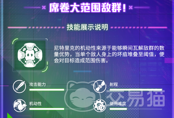 在作战距离上,尼特里克采用中程定位设计:既规避了短兵相接的风险,又避免了远程武器常见的弹道衰减与命中率下滑问题。其实际有效射程兼顾精度与响应效率,使玩家能在安全阈值内完成关键目标的优先标记与节奏调度。值得注意的是,该角色的操作门槛集中于目标选择逻辑与节奏预判——推荐优先打击敌方集群几何中心或高威胁单位,以最大化引爆覆盖面积与后续连锁反应概率。