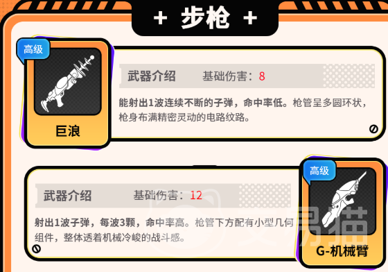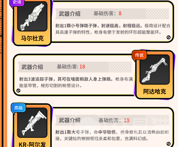步枪体系覆盖多个性能梯度,不同型号对应差异化战术定位。新手推荐从“巨浪”起步——该武器单次射击释放三发子弹,基础命中率优异,每发造成12点固定伤害,适合应对初期低强度敌人,帮助玩家快速建立操作节奏与战场信心。“阿达哈克”则聚焦爆发输出,单发基础伤害高达18点,虽精度略低,但单发压制力突出,适用于追求瞬间击杀的激进打法。“阿尔法”作为高阶步枪,配备弹跳弹道机制,子弹击中障碍物后可改变轨迹,配合厚重装甲质感的枪身设计,兼顾机动走位与持续火力输出能力。