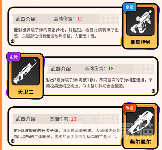 “弗尔凯尔”引入复合元素机制:子弹附带火焰伤害,并有较低概率触发电击效果,形成灼烧+短暂控场的双重压制,显著提升连续作战效率。“机械臂”属于史诗级步枪,射速快、有效射程远,采用小型化穿甲弹设计,配合极简外观与超能聚能环结构,专精于中远距离火力压制。“驯鹰短剑”以三段式连锁弹跳为特色,由多相科幻合金打造,弹道轨迹具备高度不可预测性,覆盖范围广,适用于复杂地形下的区域压制。