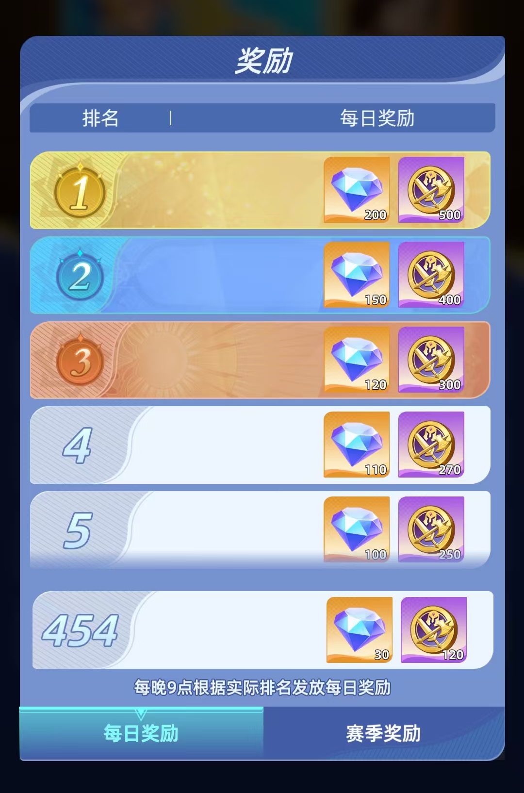 该玩法具备双重产出价值:一方面提供稳定资源供给,包括钻石、竞技币及关键养成材料(如英雄突破石、技能升级卷轴等);另一方面构建了清晰的周期性激励结构——每日21:00进行积分结算并发放邮件奖励,每周日21:00开启赛季结算,根据最终排名发放阶梯式奖励。其中全服前三名可额外获得限定头像框,属于稀有外观类道具。